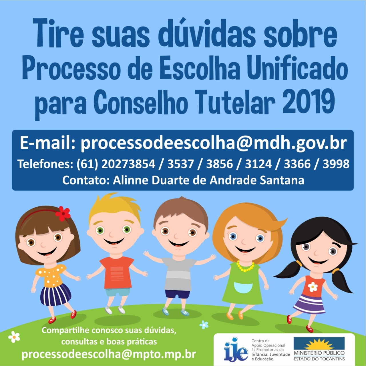 O processo de escolha dos membros do Conselho Tutelar, que se dá por meio de votação popular, ocorrerá em data unificada em todo o território nacional, no primeiro domingo de outubro de 2019, mais precisamente em 06/10/2019.