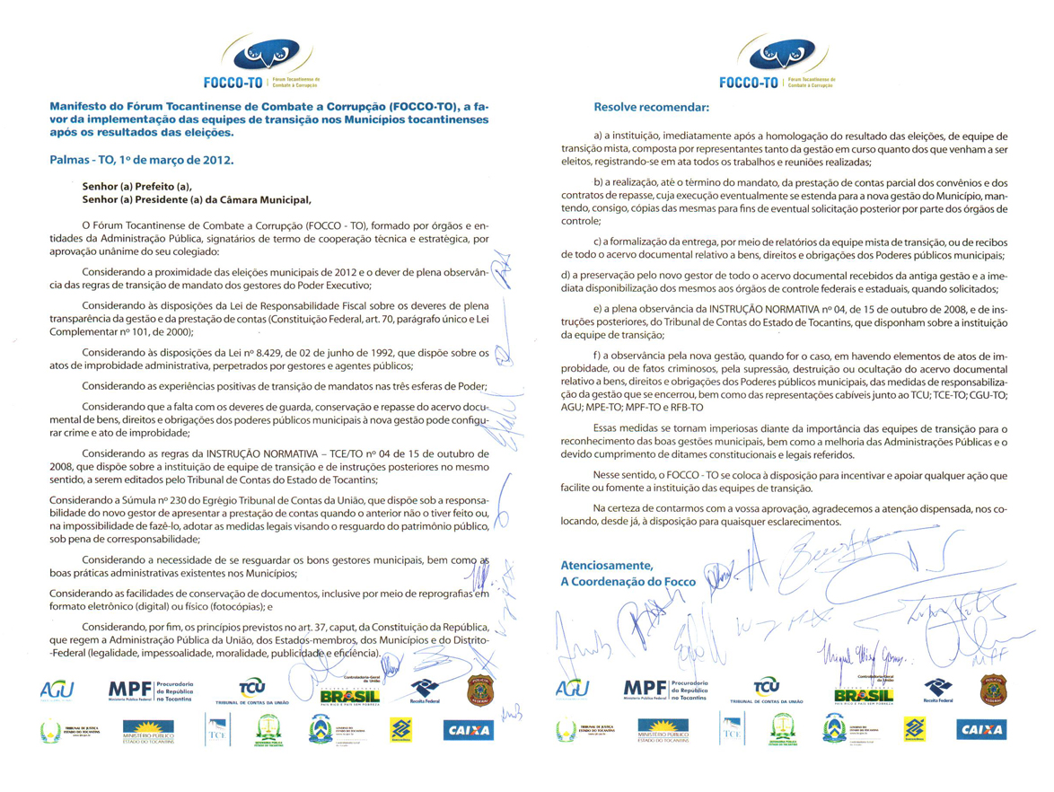 Representantes das instituições que compõem o Fórum Tocantinense de Combate à Corrupção (FOCCO-TO) assinaram na manhã desta terça-feira, 06, no auditório do Tribunal de Contas do Estado (TCE), Carta Manifesto a favor da implementação das equipes de transição nos municípios após o resultado das eleições. O documento foi apresentado pelo Procurador de Justiça Marco Antônio Alves Bezerra durante o Encontro de Gestores Municipais, que discutiu regras para transição de mandato.