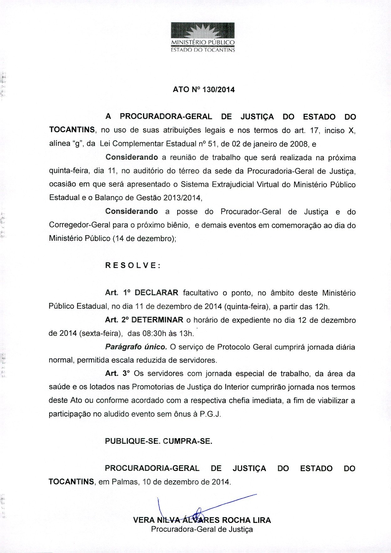 Tendo em vista a reunião de trabalho que será realizada na manhã desta quinta-feira, 11, para apresentação do Sistema Extrajudicial Virtual do Ministério Público e do Balanço de Gestão 2013-2014, o período da tarde neste dia será ponto facultativo no âmbito do MPE, segundo normatizou o Ato nº 130/2014, expedido pela Procuradora-Geral de Justiça, Vera Nilva Álvares Rocha Lira.