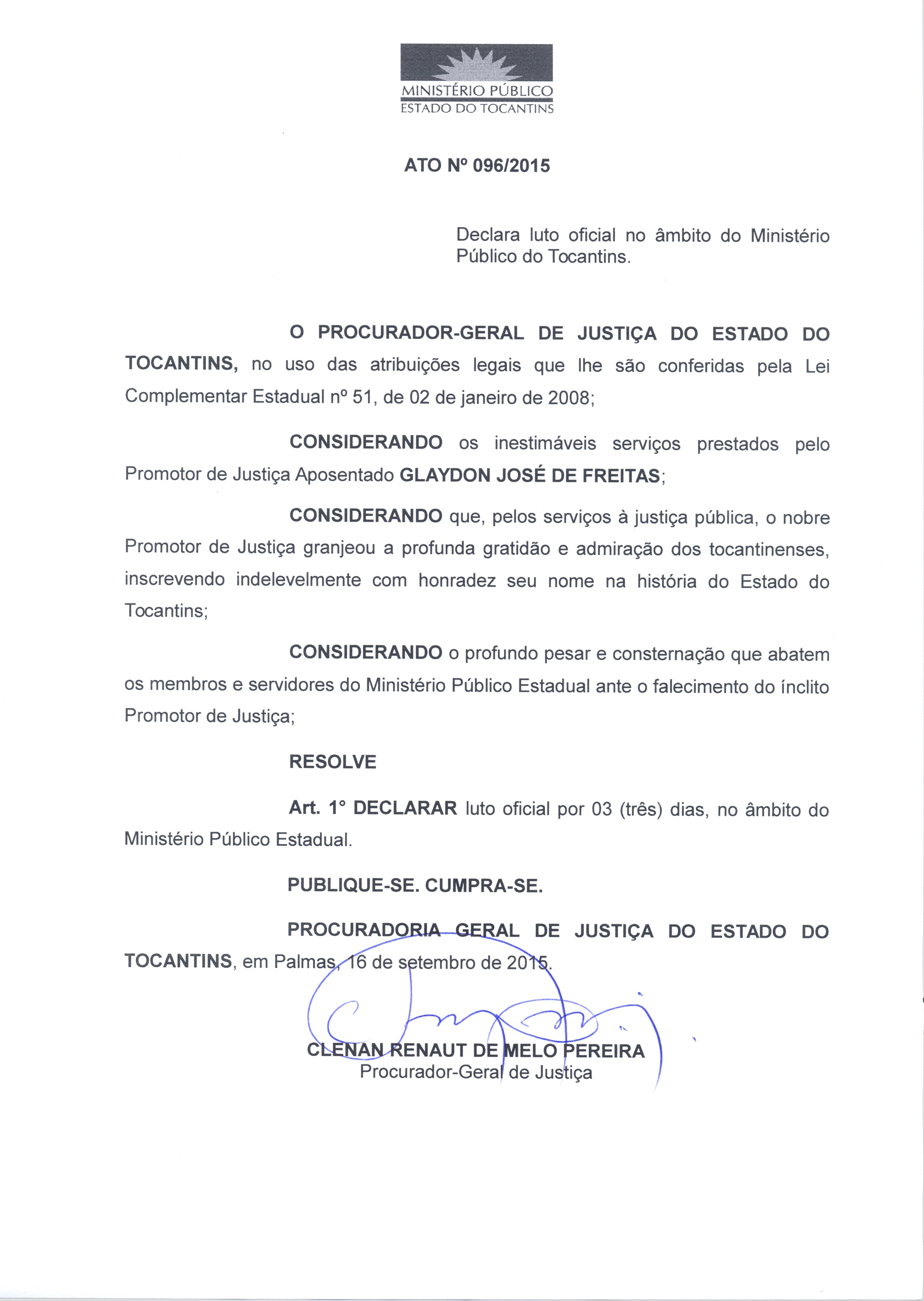 O Ministério Público Estadual (MPE) declarou luto oficial de três dias pelo falecimento do Promotor de Justiça Glaydon José de Freitas. O ato que declara o luto, assinado pelo Procurador-Geral de Justiça, Clenan Renaut de Melo Pereira, manifesta profundo pesar e consternação por parte dos membros e servidores do MPE pela morte do membro do parquet estadual.